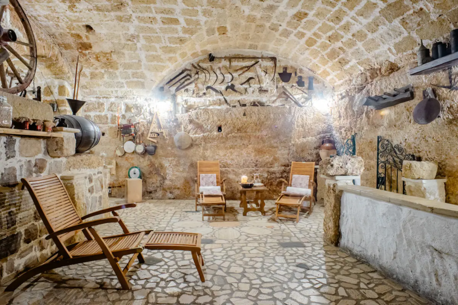Sia di questo spazio suggestivo, che dà l’idea di un grande e accogliente ventre materno, che della terrazza possono usufruire gli ospiti delle sei camere di A Locanda Tù Marchese. Purtroppo noi abbiamo potuto godere soltanto della seconda e del panorama mozzafiato su tutto il borgo di Matino e oltre, gustando l’aperitivo e l’abbondantissima colazione del mattino dopo, perché non ancora pronto all’uso l’ambiente ipogeo.