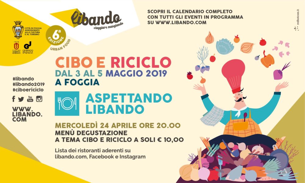 La 6^ edizione di “Libando, viaggiare mangiando” in programma a Foggia dal 3 al 5 maggio è promossa dal Comune di Foggia, Assessorato alla Cultura, in collaborazione con Di terra di mare, Red Hot, Streetfood Italia, con il sostegno di Confcommercio Provincia di Foggia, con il charity partner Banco Alimentare, con il patrocinio di Regione Puglia, Puglia Promozione, Provincia di Foggia, Federturismo Confindustria, Symbola e Università degli Studi di Foggia.