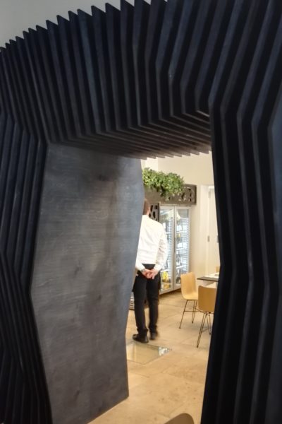 Il locale, perfetto per gli amanti del contemporaneo, ha interni essenziali con un’atmosfera che rimanda all’ambiente della grotta tra terra e mare. L’ingresso, con luci soffuse e pareti dai colori scuri che rimandano alle profondità degli abissi, ospita anche uno sharing table utilizzabile per un veloce snack o un pranzo informale in condivisione.