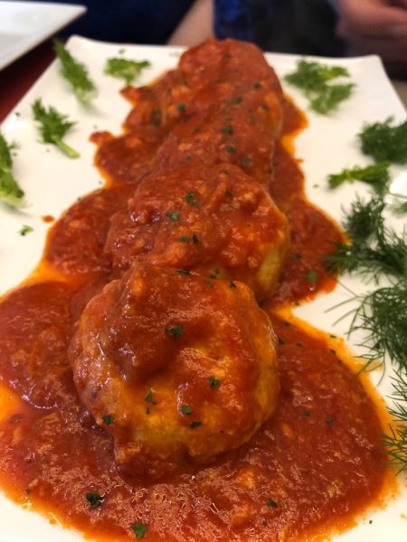 Abbiamo cominciato con un antipasto che a ogni portata ci ha ricordato che Bisceglie è sul mare e vanta un porto attivo sin dall’antichità. Dai ricci al delicato carpaccio di San Pietro fino alle squisite frittelline di salicornia passando per le polpette di orata in passata di pomodorini e cipolla.