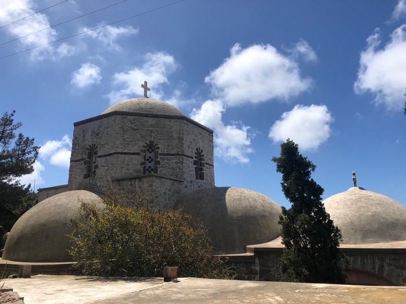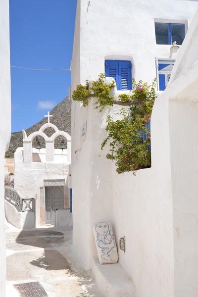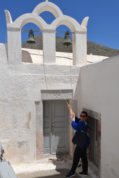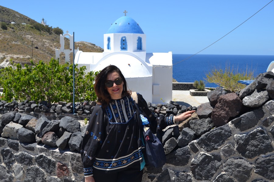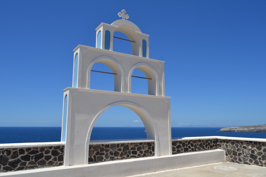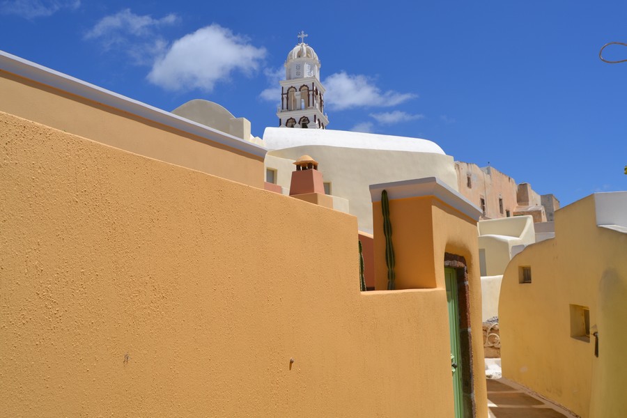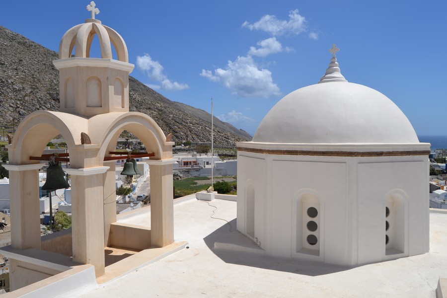 The walk can continue towards Exo Gonia, developed as an amphitheater along the mountain ridge that boasts in its territory one of the three most important churches of Santorini, the church of Agios Charalambos with its ceramic roof: the building is located high on the hill from where you can admire a splendid view of the whole island. We stumbled upon it during a wedding and took the opportunity to visit the church inside.