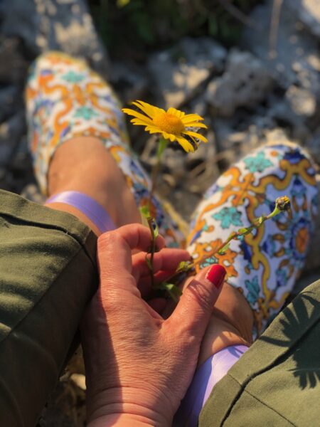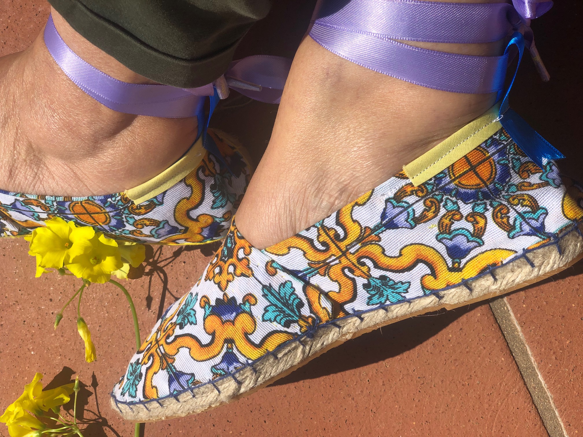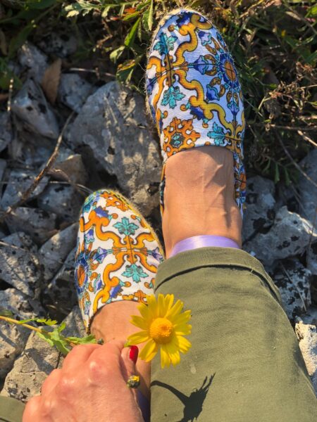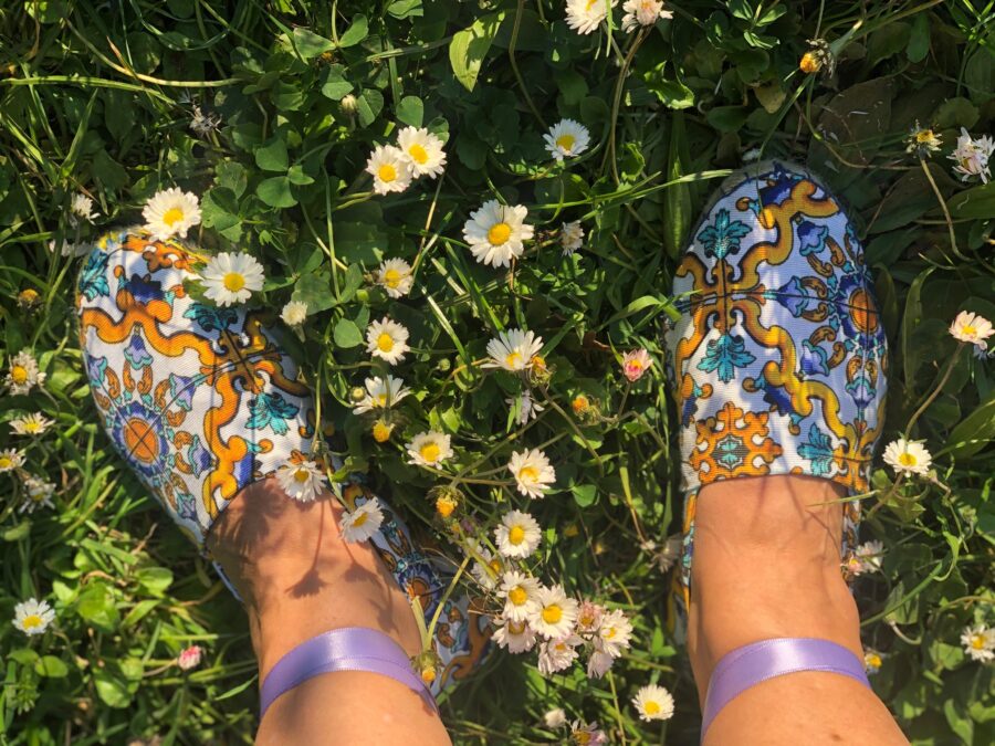 And in Burano, a super colorful and fairytale island, the slippers that Orsola creates in which straw sole and colored scraps wrap every sure step towards a desire are inspired. The strong one especially now of changing pace, feeling (and staying) at home as much as possible, but in the company of colors, flowers, fruits, which give joy, as can a family hug that recalls the scent of freshly baked cookies.