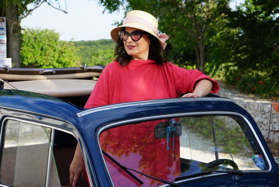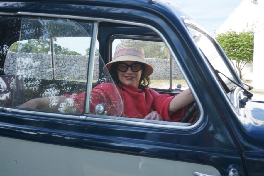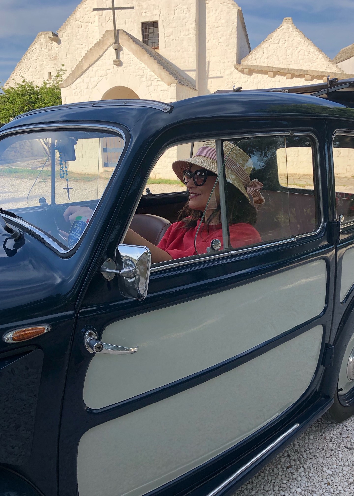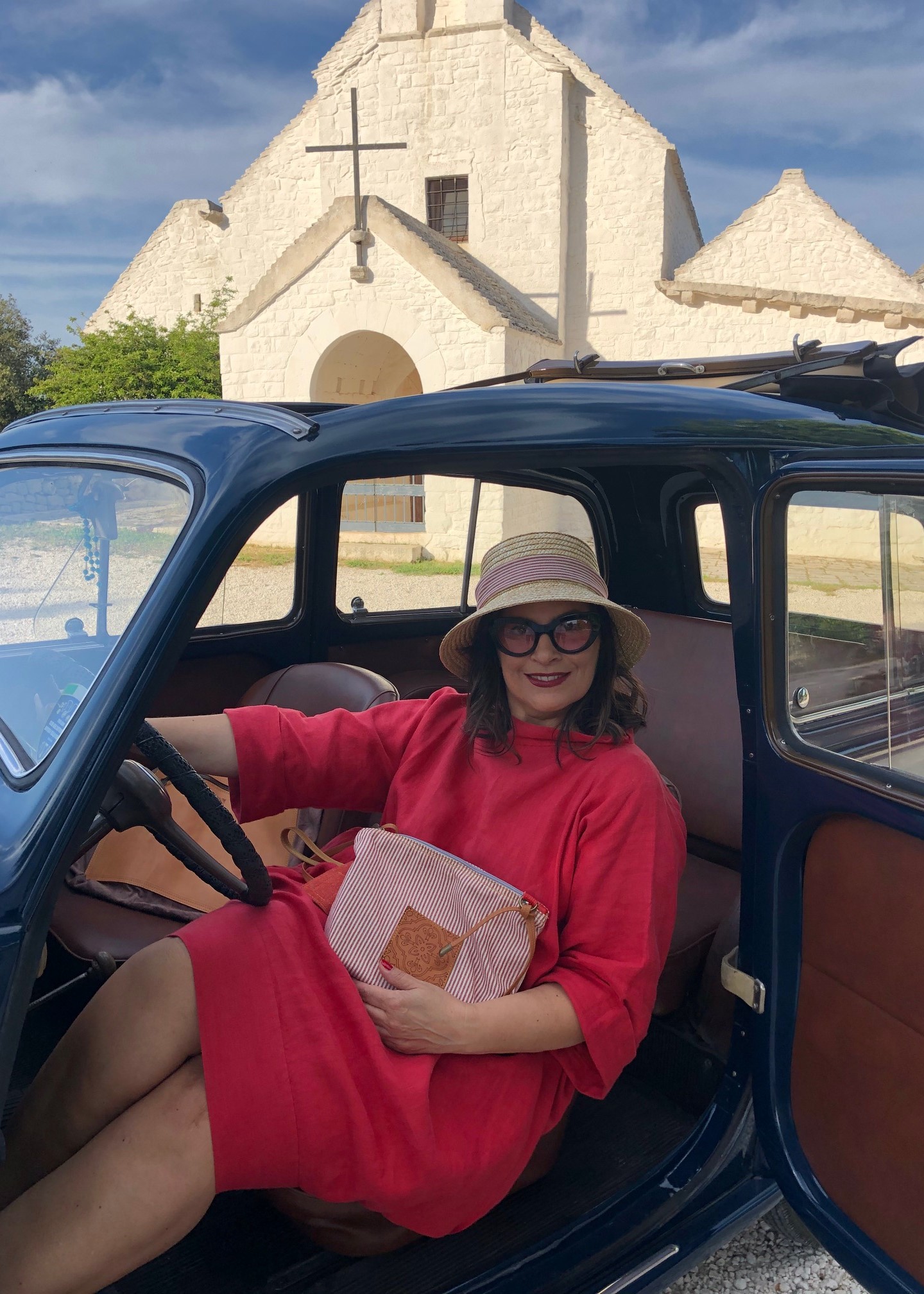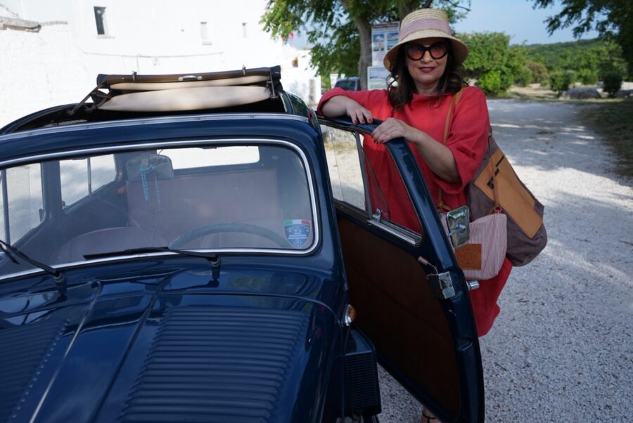 And how could we not think of recreating a context that would lead us back to that recent past lived by our grandparents and our parents? Hence the idea of creating an ideal atmosphere, even if revisited, thanks to the help of Giuseppe Gelsomino who gave us a splendid 1954 Fiat 500 Belvedere, of which he is proud owner and with whom we made a time jump in the past that allowed us to live for a few hours as on a movie set. And thanks to the sunglasses by Ottica Moschetta Selection, which recall the lines of the time in the frame with the contemporary touch of pink lenses.