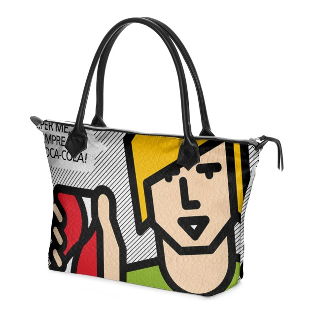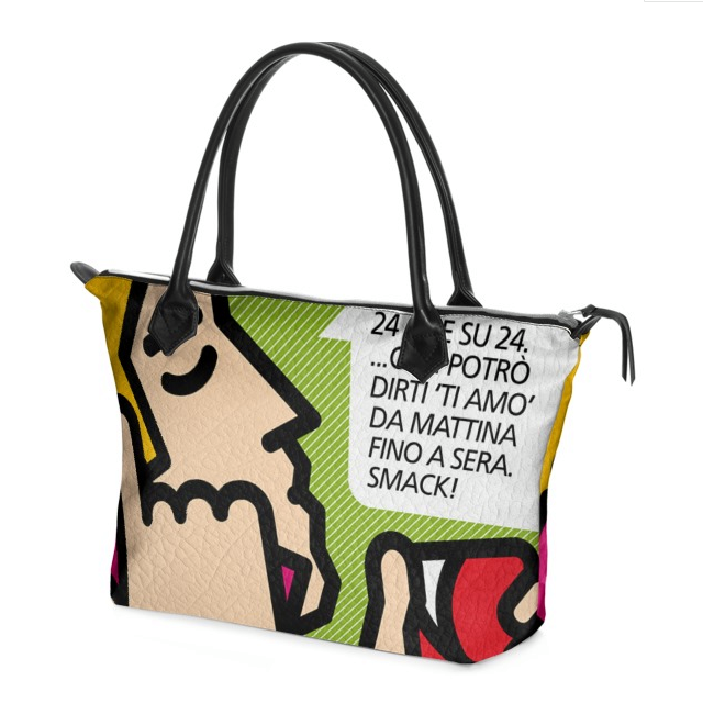 In all their artistic works, what emerges is the amused and amusing look in the representation of everyday objects. And also in this case the strong point is the ironic spirit, which as up to now has transformed the protagonists of living, such as paintings, rugs, cushions, decorated plates and wallpapers, into real works of art and design inspired by to the world of comics, from today it moves on to an iconic and indispensable accessory for many women.