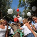 To color the bachelorete party, even women who dare. After all, on this special occasion, exaggerating it a bit ‘granted. Here, then, the invited with lovely wreaths of flowers in their hair and holding colorful balloons ready to be launched.
