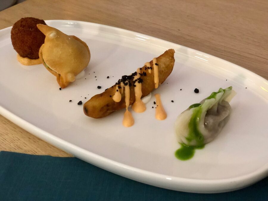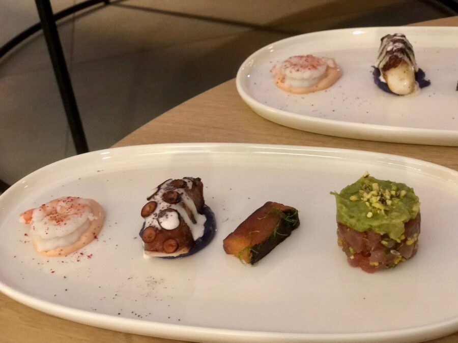 In the chef’s imagination, light fried foods based on rice arancino and potato crocché, a delicate rustic style of puff pastry with vegetables, the exquisite tuna tartare with pistachio, mint and avocado, the intense smoked salmon marinated with herbs, the delicate shrimp with mayonnaise, the tasty roasted octopus with its Mayo on veal potato cream and paprika and the superlative Gyoza stuffed with horse meat with green soy sauce.
