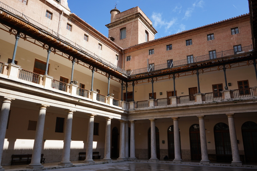 On the way to the large square paved in fine pink marble we peeked into the cloister of the building which houses the Faculty of Theology dedicated to San Vicente Ferrer, the patron of the Valencian Community.