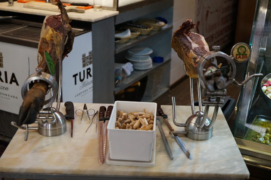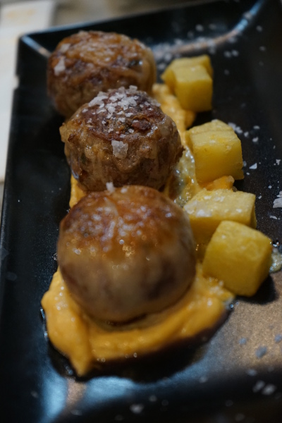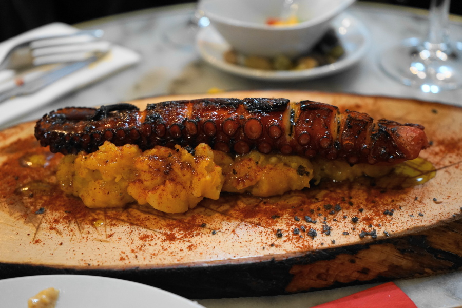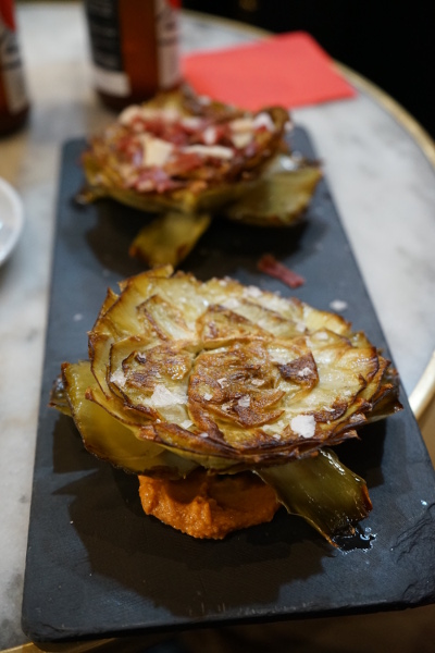 We started with an aperitif based on olives and Lola, the homemade beer produced by the house. The inevitable patatas bravas, in this case served as a sort of succulent morsels seasoned with paprika and garlic mayonnaise, local queso (cheese) and Iberian ham, intense and tasty. Beer has given way to wine to accompany subsequent dishes: exquisite artichoke hearts, succulent mini burgers with chips and a tender octopus scenically served on a section of tree trunk.