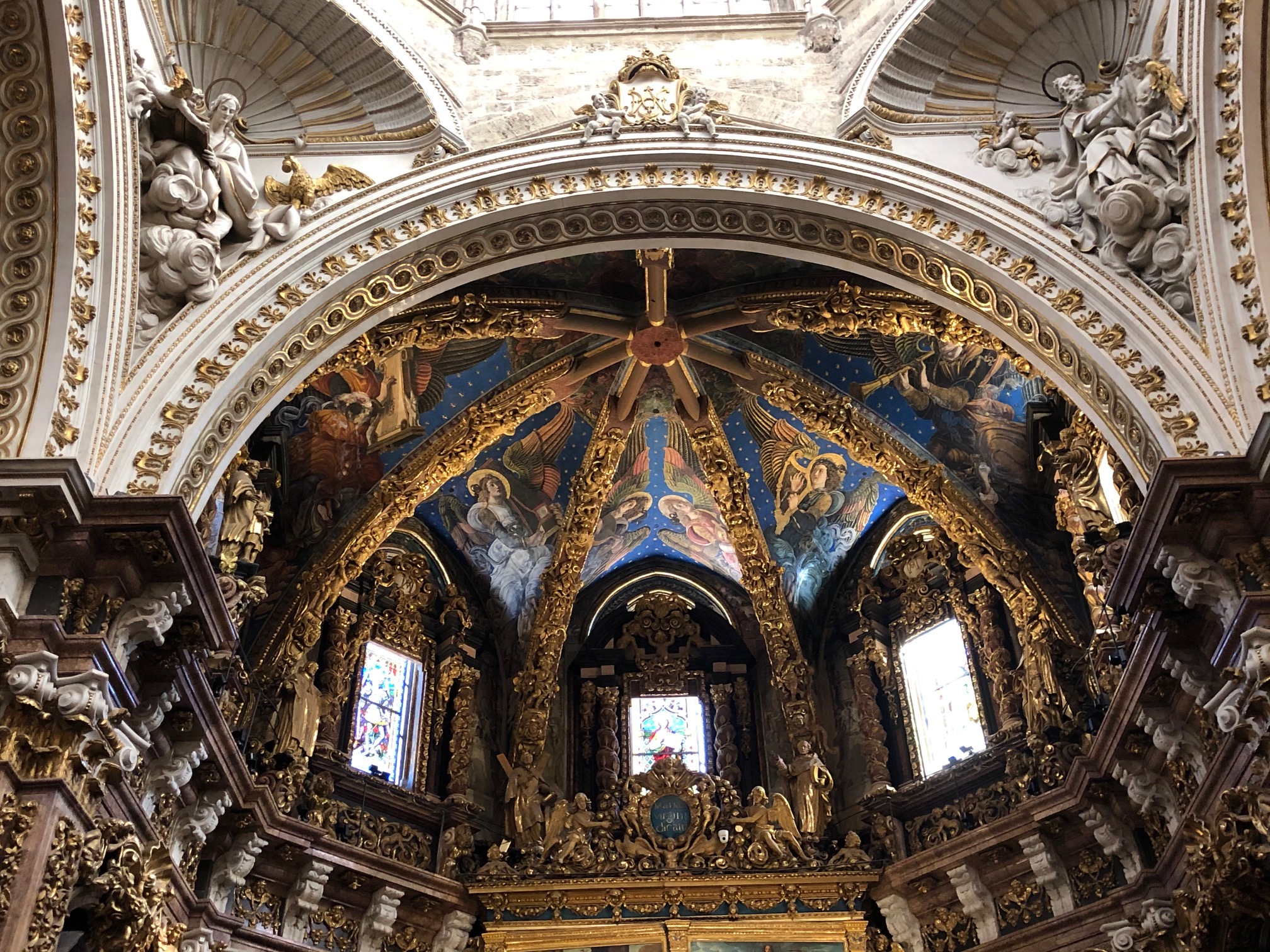 The plan is a Latin cross with three naves and many chapels in which there are several treasures, including two paintings by Goya, and an apse with a vault frescoed by a blue starry sky, not visible before 2004, the year of restoration that allowed the exceptional discovery, bringing to light, after more than 300 years, the musician Angels frescoed between 1472 and 1478 by Paolo di San Leocadio and Francesco Pagano, two Italian painters whom Cardinal Rodrigo Borgia, future Pope Alexander VI and father of Lucrezia Borgia, had brought València with him.