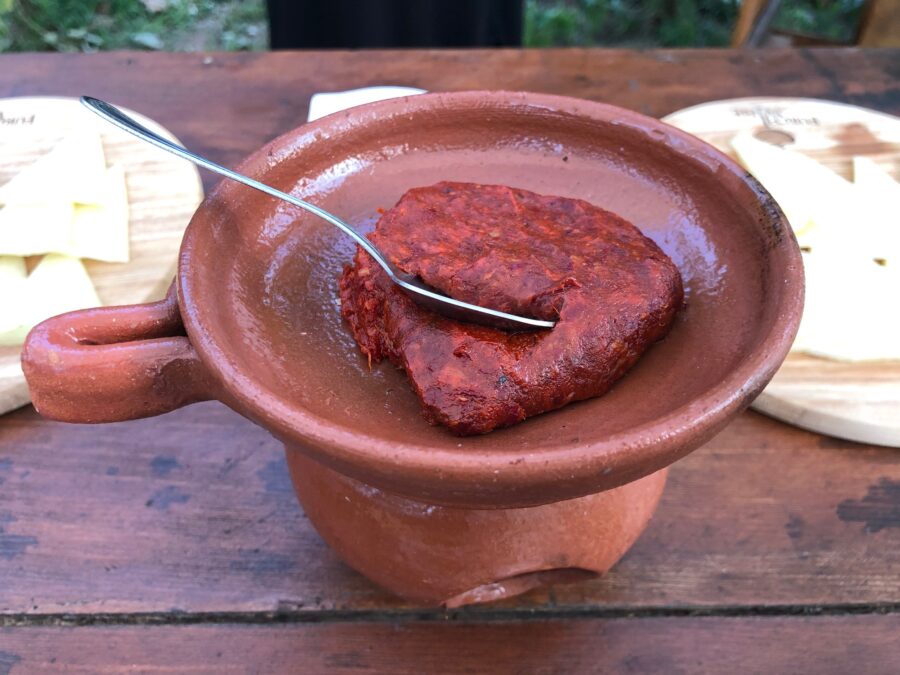 Nduja di Spilinga tenuta in caldo e pronta per essere spalmata sul pane, formaggio
