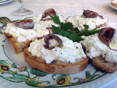 Dopo la passeggiata, abbiamo potuto gustare alla luce del tramonto una squisita e gradita merenda a base di pane, ricotta fresca di capra, alici di Cianciola e la birra artigianale cilentana del Birrificio dell’Aspide di Roccadaspide continuando a chiacchierare con Gino che ci ha parlato dell’azienda di famiglia che prende il nome da una nota famiglia di Celso, gli Amoresani, ed è nata venti anni fa. Oggi conta 100 capre, maiali, cinque vacche podoliche e cavalli di razza salernitana e maremmana da montare per una bella passeggiata nei boschi. L’azienda, estesa su cento ettari, è situata ai piedi del Monte Stella che domina tutta la Costa Cilentana, ed è rinomata per la sua produzione di olio e di cacioricotta di capra, sottoposto oggi per ragioni igieniche a ventilazione forzata in celle chiuse, ma che una volta veniva asciugato dal vento del pomeriggio appeso a una rete sotto gli ulivi. Presso I Moresani ci si può fermare a pranzo o a cena, a base di prodotti aziendali e di piatti tradizionali del Cilento, e anche a dormire. Infatti la struttura dispone di 10 camere e 5 appartamenti, oltre che di una bella piscina tra il verde. La cena non ha deluso le aspettative, permettendoci di apprezzare i salumi, i formaggi e le verdure prodotti in azienda, i cannelloni ripieni di ricotta, i carciofi al sugo di pomodoro, il cinghiale in umido, per finire in dolcezza con crostata di ricotta e pere e tiramisù al limoncello.
