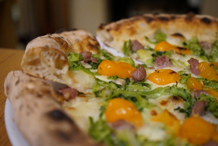 Il risultato? Ben 60 pizze diverse proposte in menu a rotazione a seconda della stagione. L’ultima nata? Il nome lo hanno scelto i clienti ed è stato votato su Facebok tra una rosa di cinque. Quello più gettonato è stato Van Gogh e così si chiama la pizza dall’impasto integrale con crema di broccoletti, fiodilatte, stracciatella, gamberi violette locali marinati al bergamotto e scorzetta di limone grattugiata.