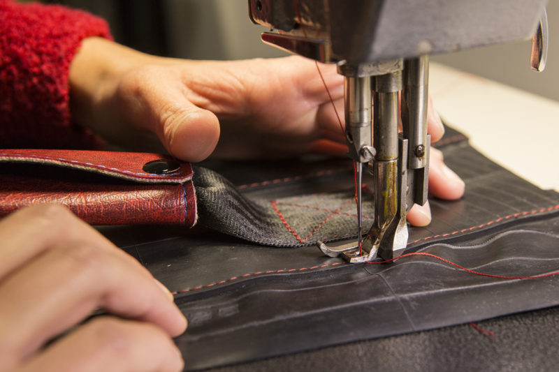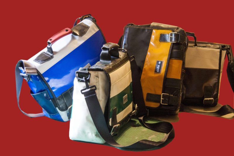Tutte sono oggetti unici, creati con materiali di riciclo come camere d’aria, recuperate da rivenditori di biciclette e gommisti; ritagli di pvc recuperati da tendonifici; cinture di sicurezza delle auto selezionando solo quelle posteriori data la loro minor usura.