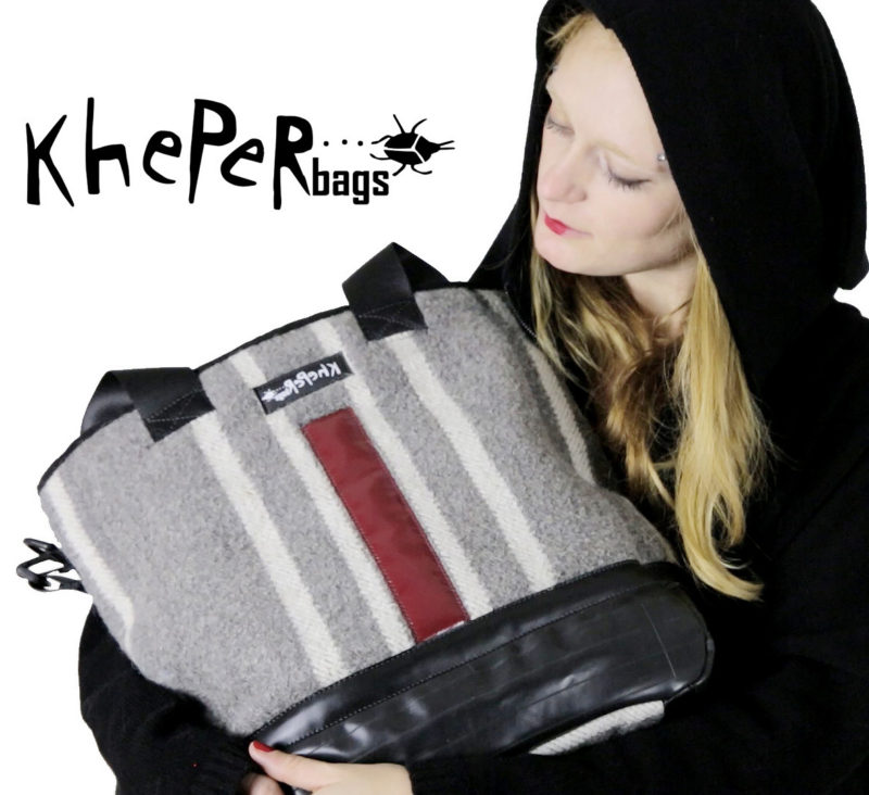 L’idea che sta alla base delle Kheper bags è che tutti i materiali possono scoprire una nuova vita al termine della loro funzione: trasformandosi, risorgendo. Proprio questo è il significato in egiziano antico della parola kheper, lo scarabeo simbolo delle creazioni di Luca che mirano a una clientela convertita al superamento della cultura consumista, dando forma ai propri sogni e bisogni.