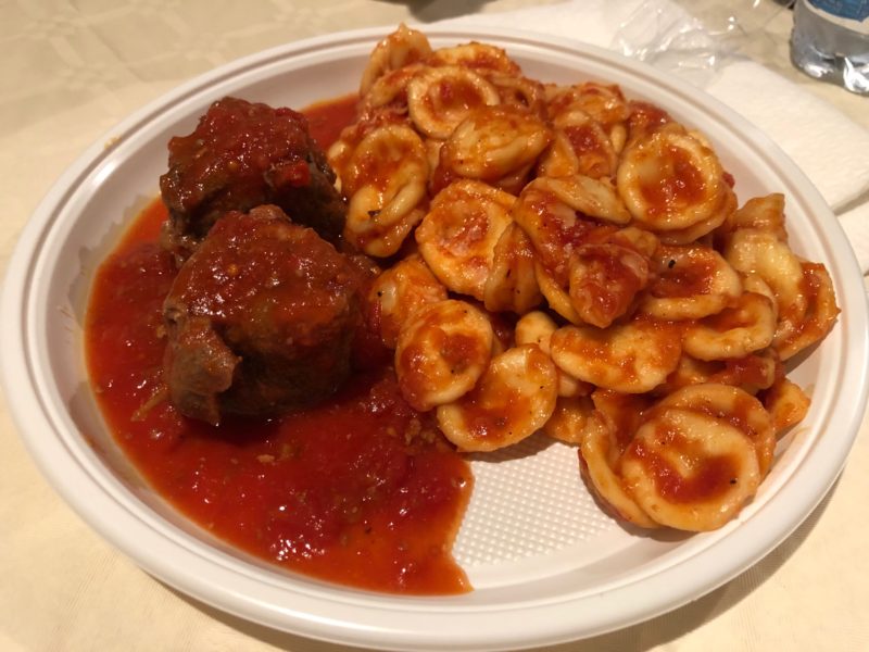 A proposito di folla: ce n’è davvero tanta! Le file si formano fin dai punti in cui vengono venduti i ticket di acquisto delle quattro varietà di orecchiette, alla crudaiola, al sugo di pomodoro con basilico, al ragù con le braciole e alle cime di rape con le alici, e della purea di fave con i peperoni verdi fritti che qui si chiamano cornaletti.