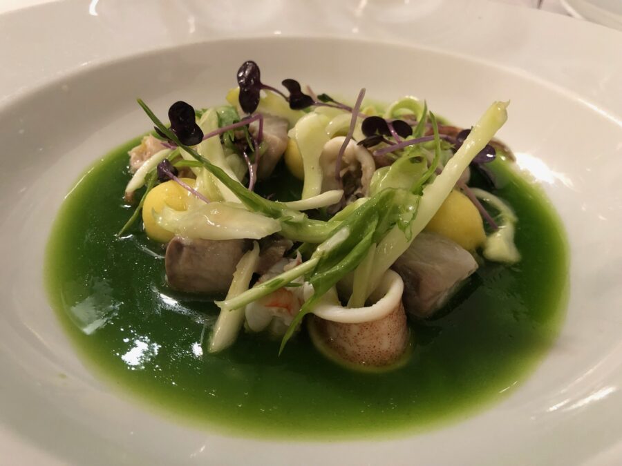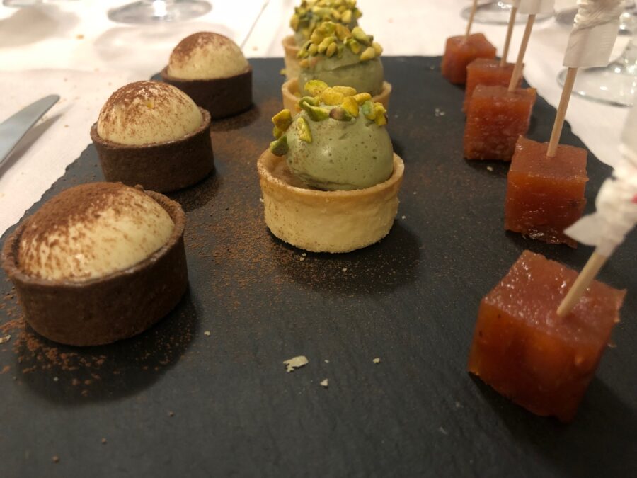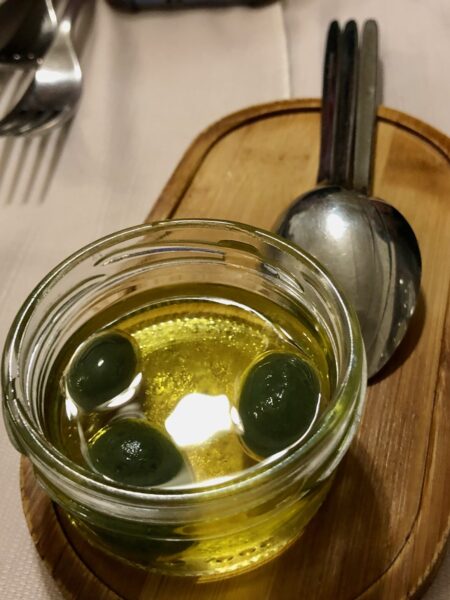 Ma cominciamo dall’inizio. Non appena seduti a tavola sono arrivati fragranti grissini alla pizzaiola e subito dopo una serie di piccole portate, tra cui le sorprendenti sfere di olive verdi che esplodono in bocca e le panelle al tartufo nero estivo, una sorta di soffici bomboloni salati.