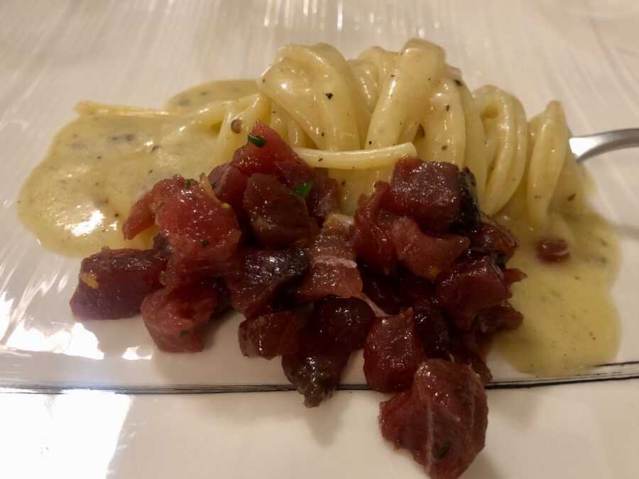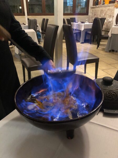 A seguire insalata calda di pesce con cicorie in due consistenze e spaghetti cacio pepe con tartare di tonno. Notevoli anche i dolci tra cui la cotognata leccese e la confettura di noci verdi oltre alle pignette già citate. E per digerire tutto e tenere lontane le negatività un punch “infuocato” a base di arancia, chicchi di caffè, limone e alcol.