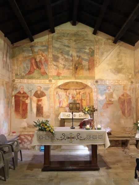 All’interno di quello che è stato definito un capolavoro del Rinascimento si prova una sensazione di pace e bellezza grazie al candore della pietra abbellita da cordoni scolpiti che ne arricchiscono anche l’abside diviso da una serie di nicchie tra colonne corinzie finemente intagliate.