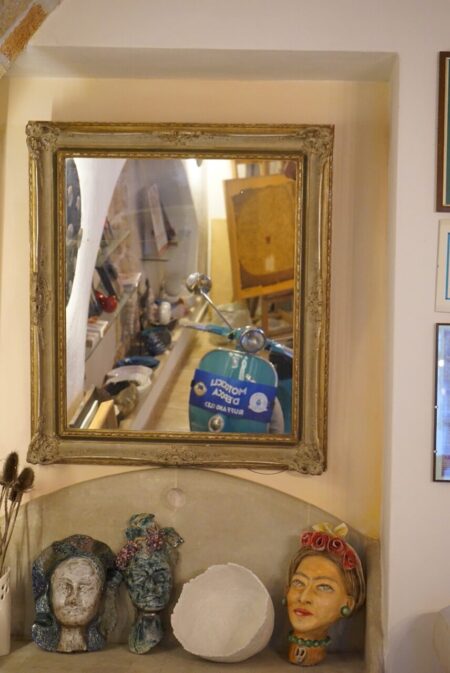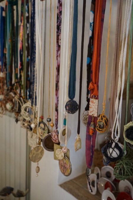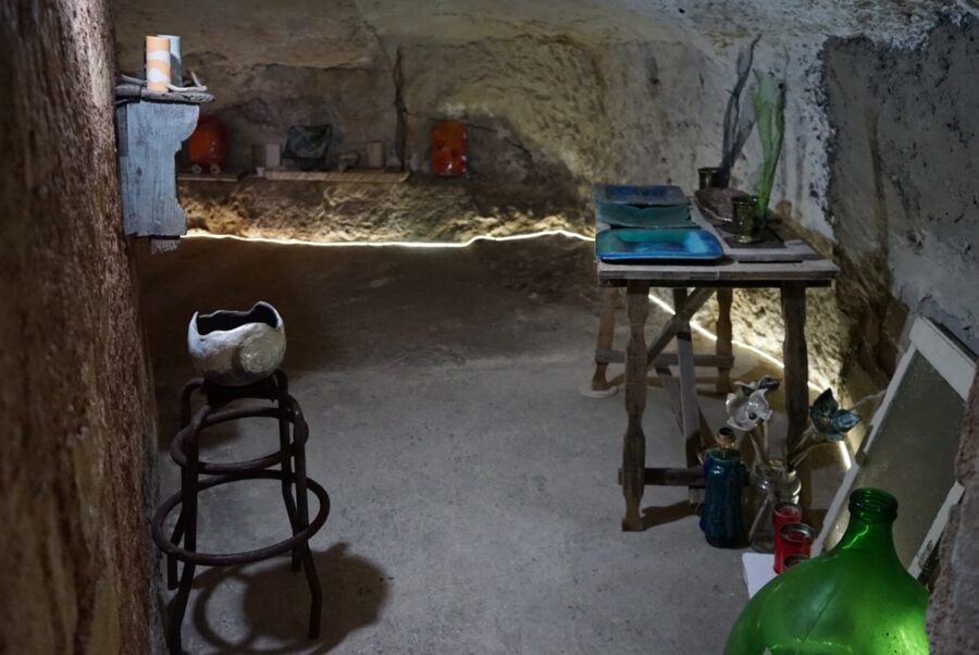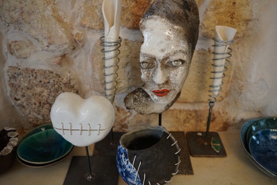 Entrando nel suo show room diviso tra il pian terreno della sua splendida casa e i sotterranei del frantoio ipogeo si resta incantati dalle sue creazioni artistiche che spaziano tra ornamenti, gioielli, arazzi, sculture, complementi d’arredo che a prima vista appaiono come reperti archeologici, oggetti arcaici e attuali al tempo stesso attraverso un gioco a tratti trasgressivo tra forma e materia con rimandi a simboli o iconografie religiose.