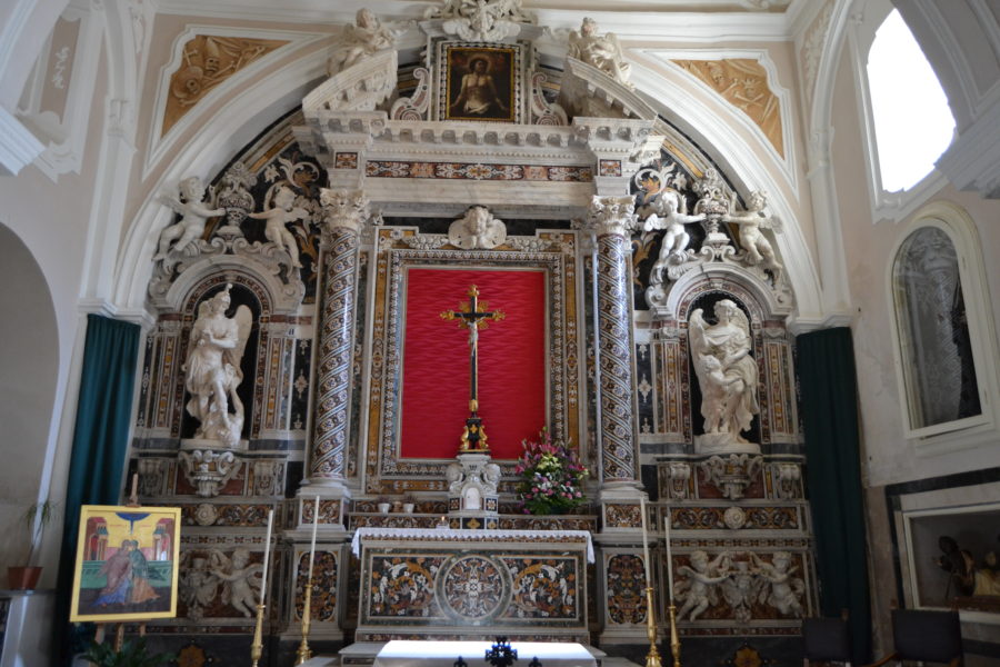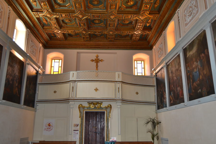 Nell’unica navata lasciano a bocca aperta il ricchissimo altare intarsiato di marmi e pietre dure di scuola napoletana e il soffitto a cassettoni, mentre sulle pareti spiccano le 14 tele del Brunetti che raffigurano le opere di Misericordia corporali e spirituali.