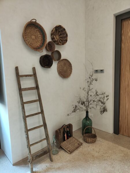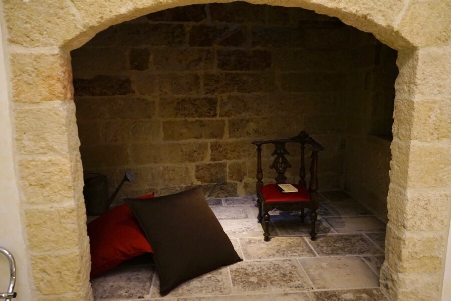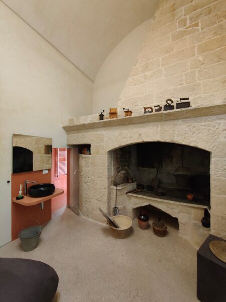 Ci ha accolto il giallo solare di Pajare, che rimanda alle antiche costruzioni rurali locali, tipiche del posto, realizzate con la tecnica del muro a secco. Nell’ampia stanza spicca un grande focolare che oggi fa da raccolta sala lettura o “pensatoio”, facendo rivivere il passato in un’altra veste con semplicità, cura e rispetto.