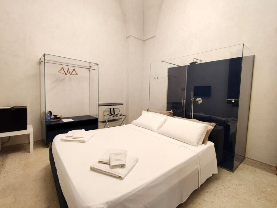 L’altra stanza che si affaccia sul grande salone che fa da living room è la LuMare che riporta subito alla mente il blu delle acque più profonde e intense dello splendido mare del Salento con elementi in tinta e una grande doccia a vista che fa da testata al comodo letto matrimoniale.