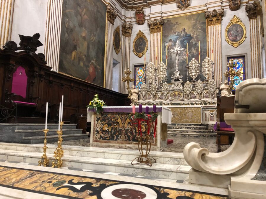 La seconda tappa è stata la Biblioteca Finya, uno scrigno che custodisce oltre 11mila volumi, dove ci ha accolto Don Giacomo Lorusso mostrandoci veri e propri tesori cartacei come il piccolo libro di preghiere di San Carlo Borromeo e il voluminoso libro del Conclave del 1730.