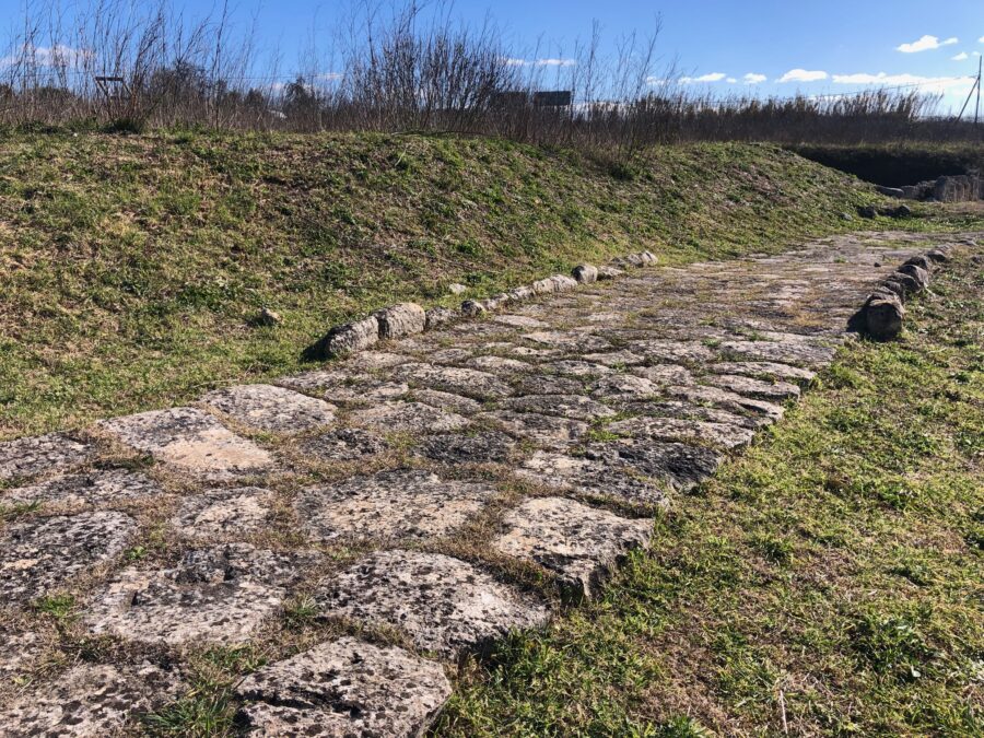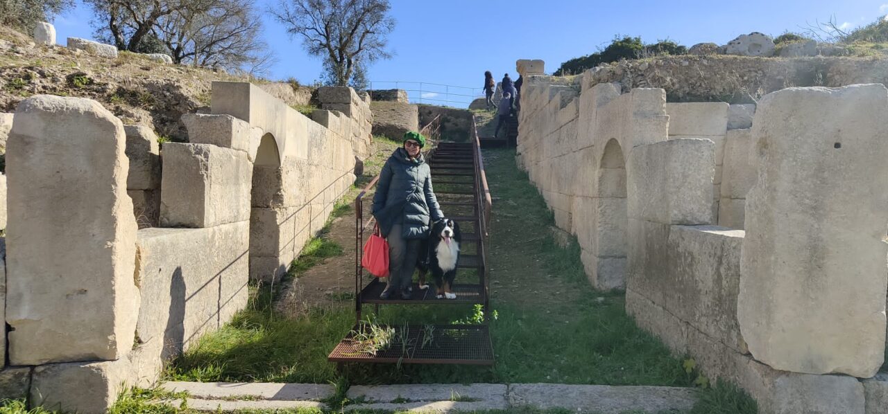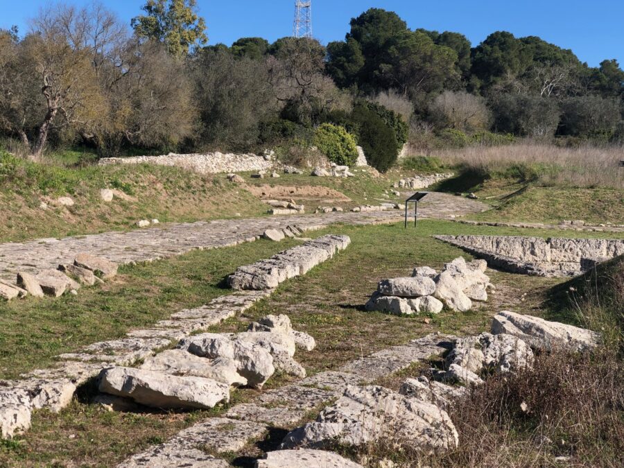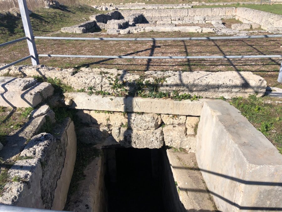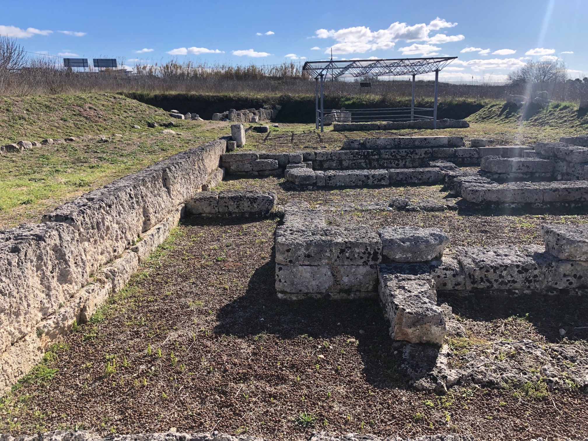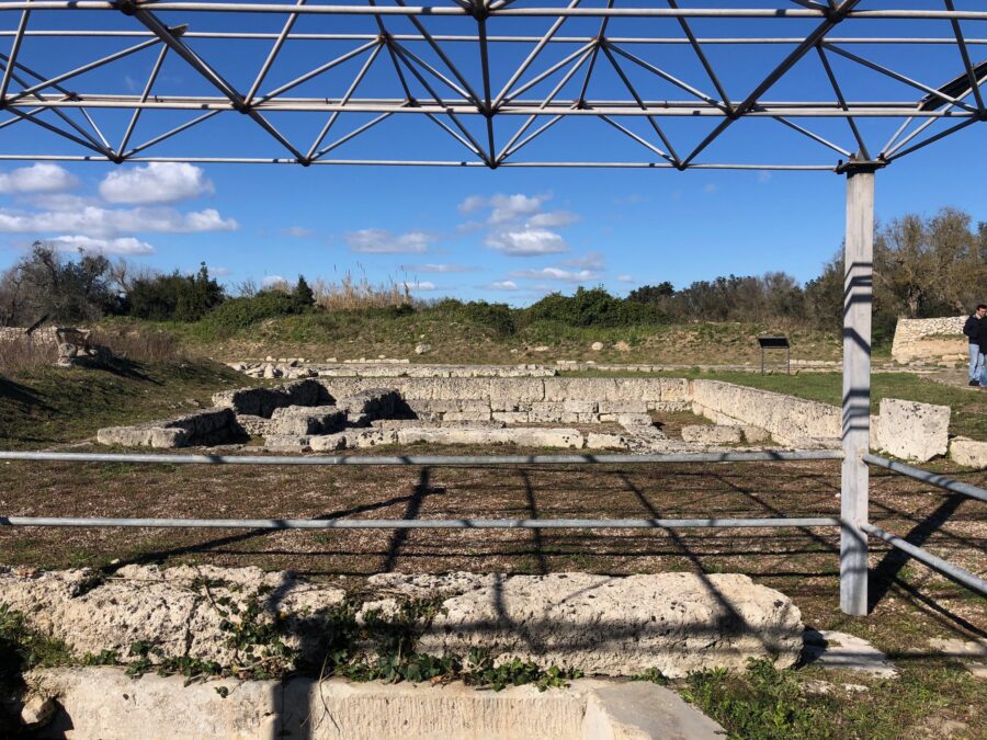 Il percorso di visita comincia dall’area di Fondo Acchiatura, dove emergono le strutture archeologiche messe in luce nel corso degli scavi degli anni ’50. L’archeologo ci ha fatto notare le due strade ortogonali, il luogo di culto e l’ipogeo ellenistico, al quale non è possibile accedere.