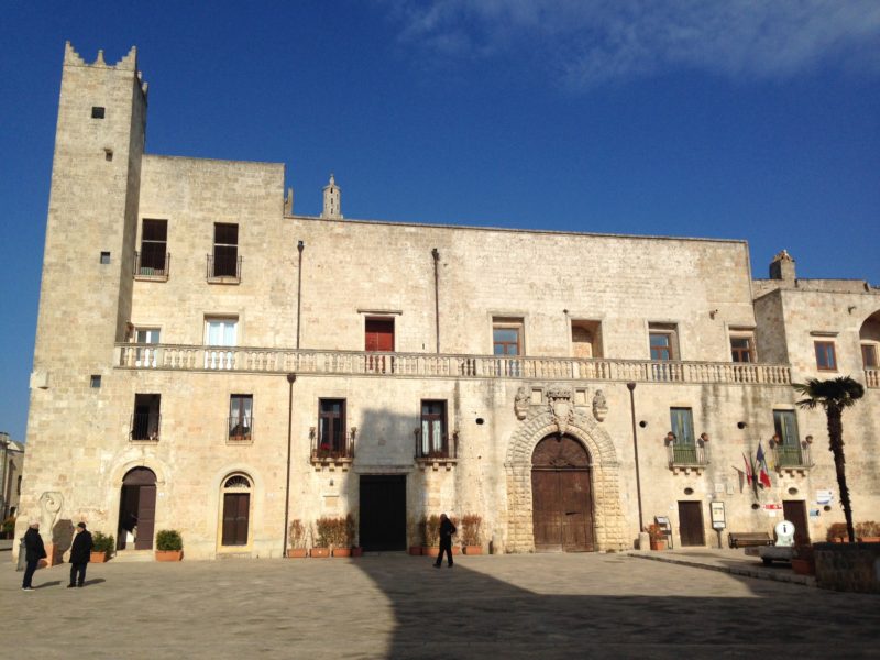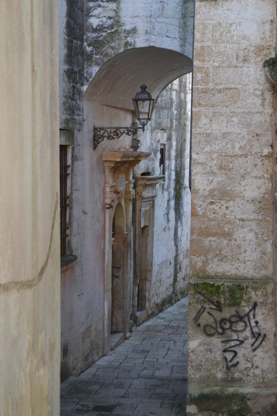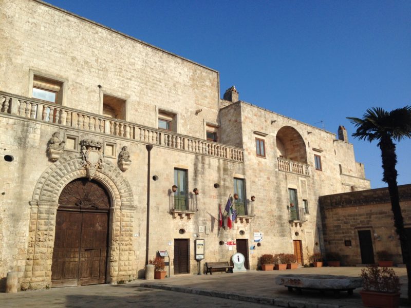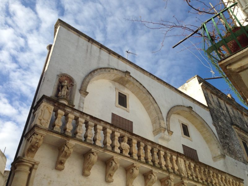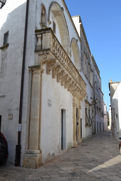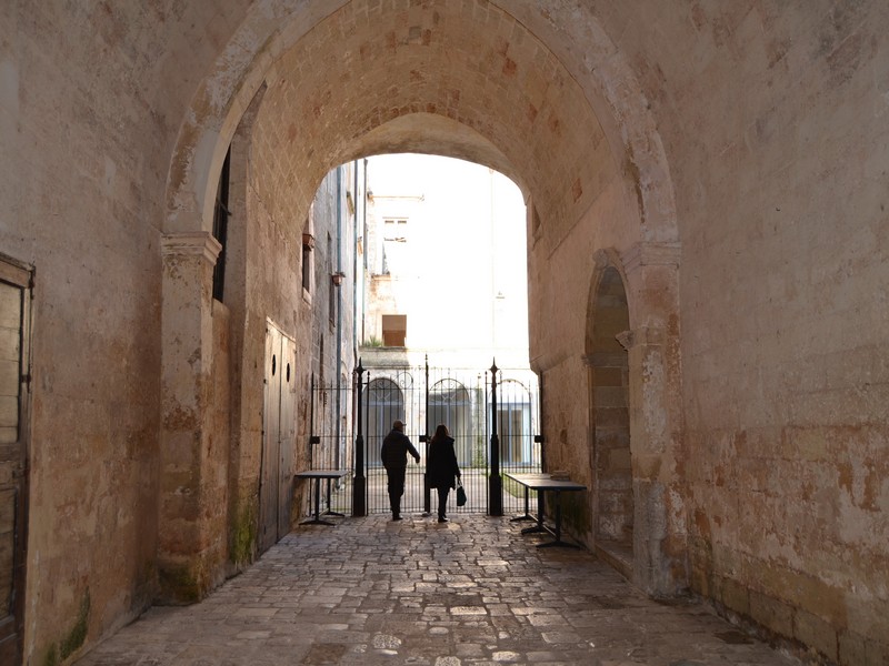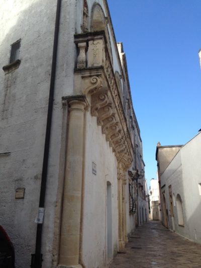 Dagli “inferi” dei trappeti siamo riemersi in superficie accompagnati dalla nostra simpatica e disponibile guida, il signor Domenico Baglivo della Pro Loco di Specchia, per attraversare la grande piazza illuminata dal sole ed entrare nell’atrio del Palazzo Protonobilissimo-Risolo, una imponente costruzione cinquecentesca, poi rimaneggiata nei secoli successivi.