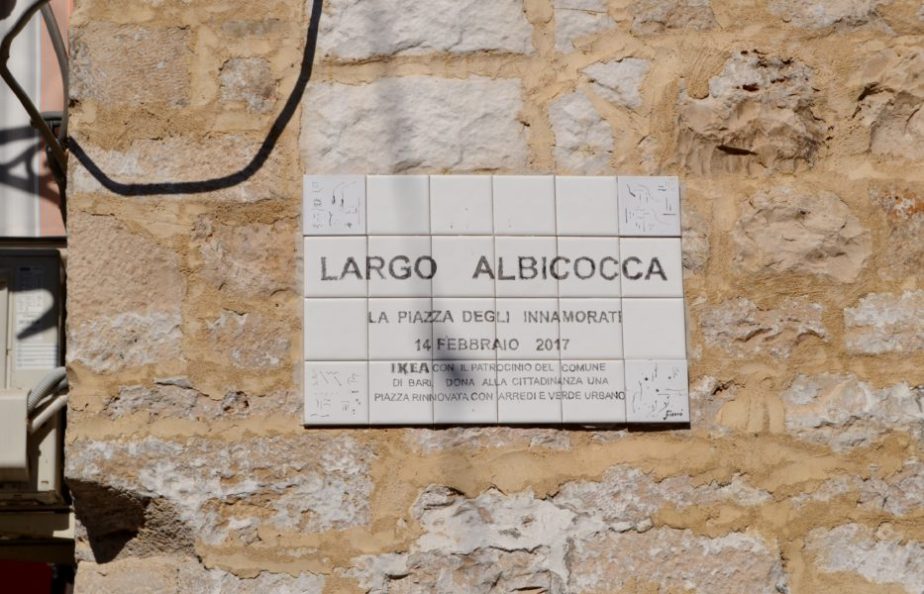 Caratteristico anche Largo Albicocca, uno degli scorci più belli di Bari Vecchia, che dal 14 febbraio di quest’anno, in occasione dei 10 anni di presenza del colosso svedese Ikea a Bari, è diventata la ‘piazza dell’amore’ con la donazione di arredi, pannelli e innaffiatoi colorati, che hanno riqualificato e reso più allegro lo spazio urbano.