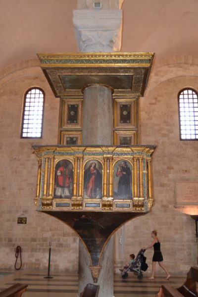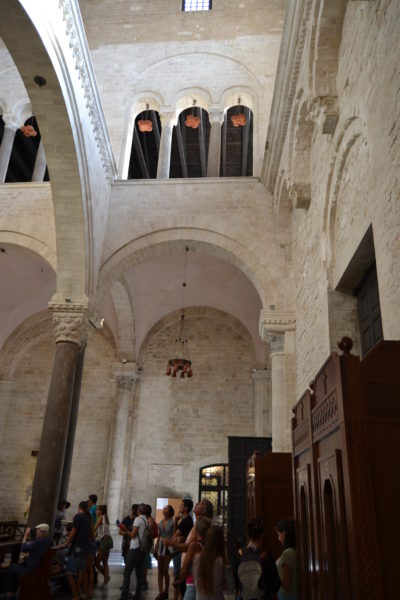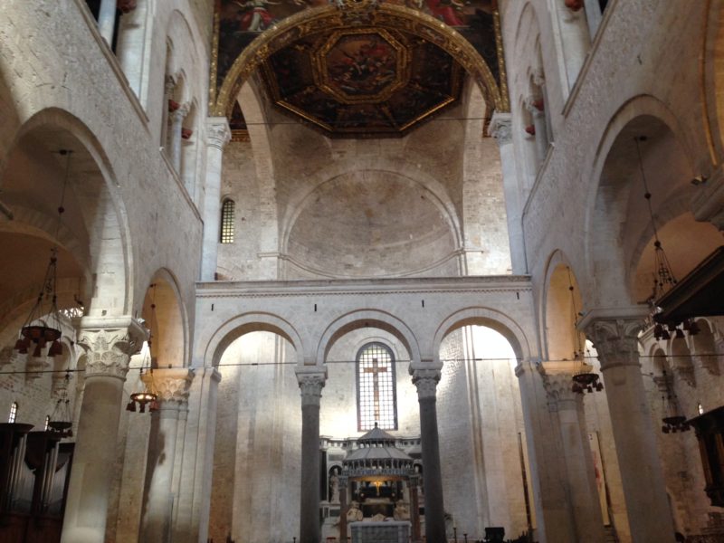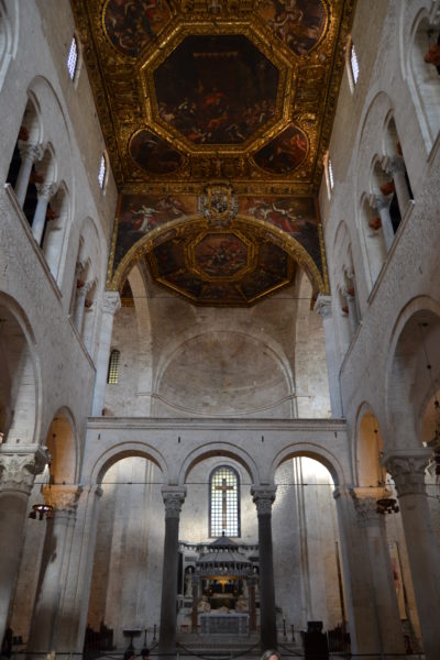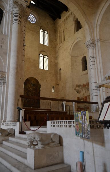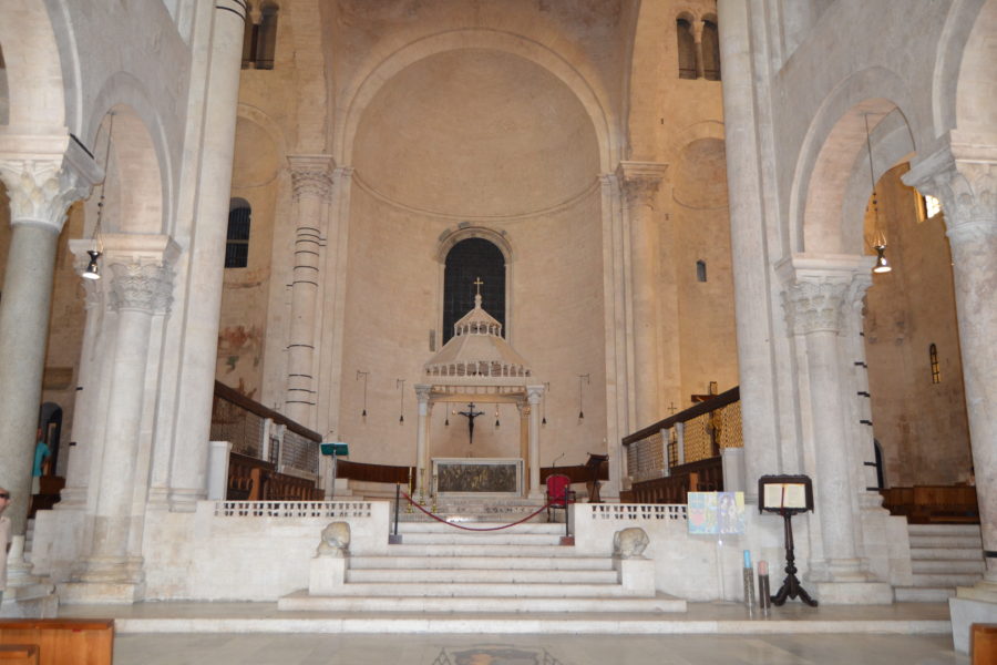 Nell’abside centrale sopra l’altare maggiore sotto il baldacchino c’è la cattedra del vescovo Elia, fondatore della basilica, un vero e proprio capolavoro della scultura romanica. Alle sue spalle il monumento a Bona Sforza, l’ultima duchessa di Bari, che sembra vegliare sulla chiesa e sulla città.