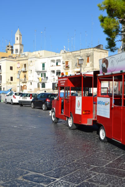 Tornati sul lungomare abbiamo ripreso il nostro trenino e abbiamo continuato il giro tra la muraglia medievale e il mare. Nella giornata fresca e limpida sfilano davanti ai nostri occhi il Fortino, il monastero di Santa Scolastica, le mura del castello su piazza Federico II di Svevia con le alte case medievali e la chiesa della Santa Trinità.