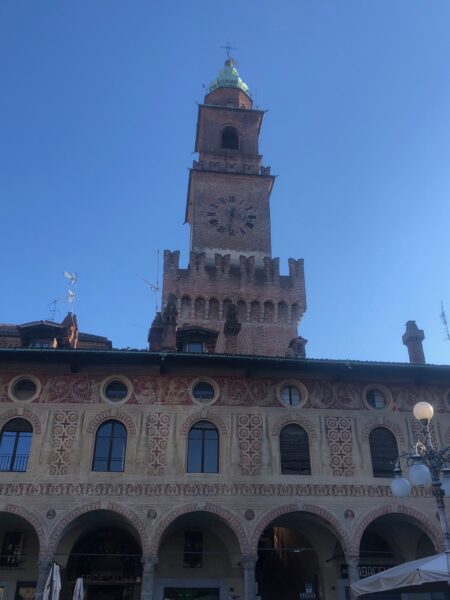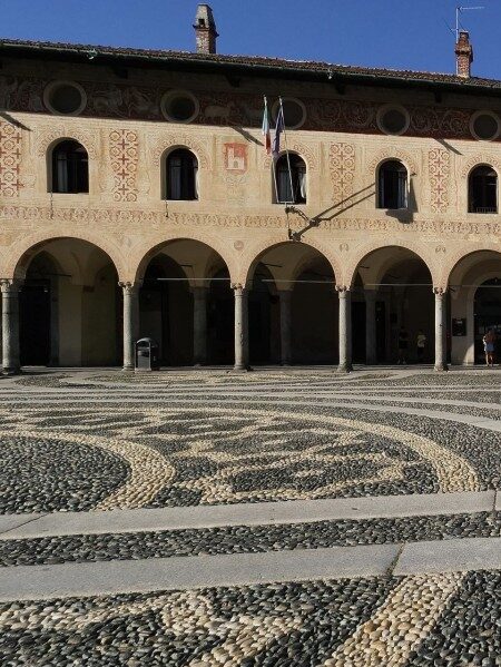 Gli eleganti portici affrescati con gli stemmi ducali, la facciata barocca del Duomo, dominati dall’alta torre d’ingresso al castello, detta Torre di Bramante, sono uno scenario indimenticabile che si apprezza passeggiando sul pavimento di pietre irregolari raccolte sulle sponde del Ticino.