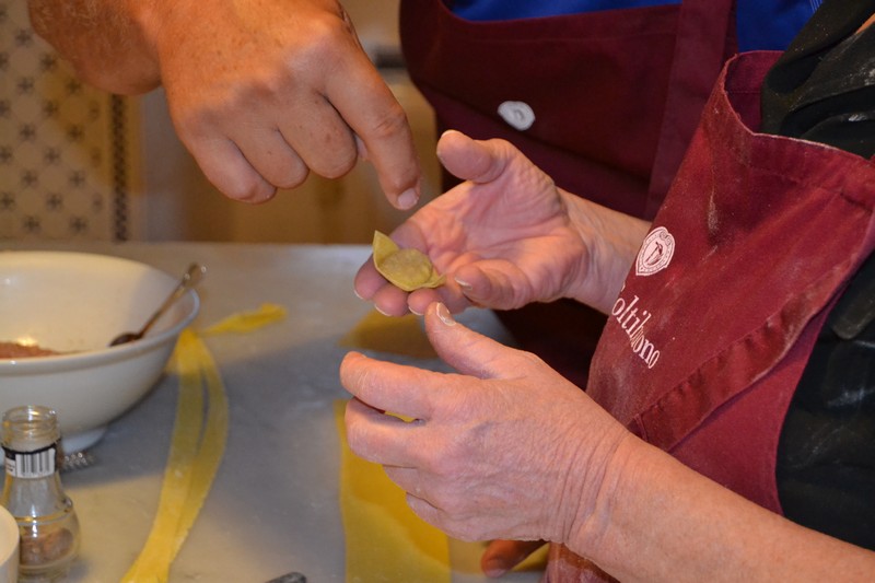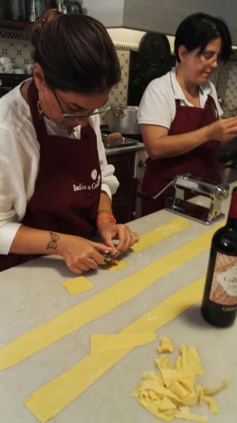 Tornando al nostro corso, è stato davvero divertente cimentarsi a fare i tortellini, stendendo la pasta e riempiendoli a uno a uno, e poi preparare il vitello tonnato e il tiramisù con istruzioni impartite rigorosamente in lingua inglese dalla simpatica Benedetta. Infatti, i nostri compagni di corso nella grande e accogliente cucina di Coltibuono sono stati due americani di Dallas autenticamente innamorati della gastronomia italiana. Ed è stata un’esperienza golosa, piacevolissima e internazionale cenare tutti insieme alla tavola elegantemente apparecchiata dove nel frattempo ci ha raggiunti anche Emanuela e dove sono state servite le pietanze preparate da noi.